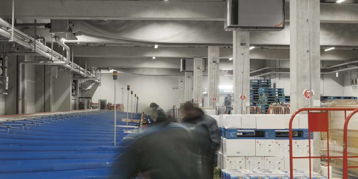 Aufgrund dieser Vielzahl an Problemstellungen suchte Frigosuisse daher nach einer Möglichkeit, den Staub in allen Bereichen deutlich zu reduzieren, zum Wohl von Mitarbeitern, Waren und Maschinen. »Da unsere Mitarbeiter bereits einer hohen Belastung durch Kälte ausgesetzt sind, wollten wir auch die Arbeitsumgebung optimieren, indem wir die Luft deutlich verbessern und den Reinigungsaufwand reduzieren. Sauberkeit gehört dazu und es soll so sein, dass sich die Leute hier drin wohlfühlen. Darüber hinaus möchten wir nicht nur Behördenkontrollen, sondern auch Kundenaudits mit besonders strengen Qualitätsanforderungen wie zum Beispiel aus der Pharmaindustrie gerecht werden. Intern haben wir viel diskutiert bei der Suche nach einer Lösung für unser Staubproblem. Beispielsweise überlegten wir, doch die Nassreinigung zu erhöhen, aber das ist nun mal kritisch im Tiefkühlbetrieb. Weiterhin haben wir Maschinen gekauft, die weniger Staub aufwirbeln, aber auch das brachte keine zufriedenstellenden Ergebnisse«, erzählt Schneider. »Als wir vom Konzept der Zehnder Luftreinigungssysteme hörten, waren wir zunächst etwas skeptisch, weil wir bisher noch nicht von der Möglichkeit gehört hatten, Staub und Schmutz direkt aus der Luft zu filtern, bevor diese sich ablagern können. Eine mögliche Staubreduktion von bis zu 80 Prozent hat uns jedoch überzeugt.«