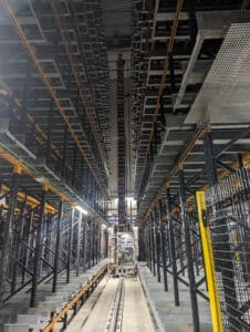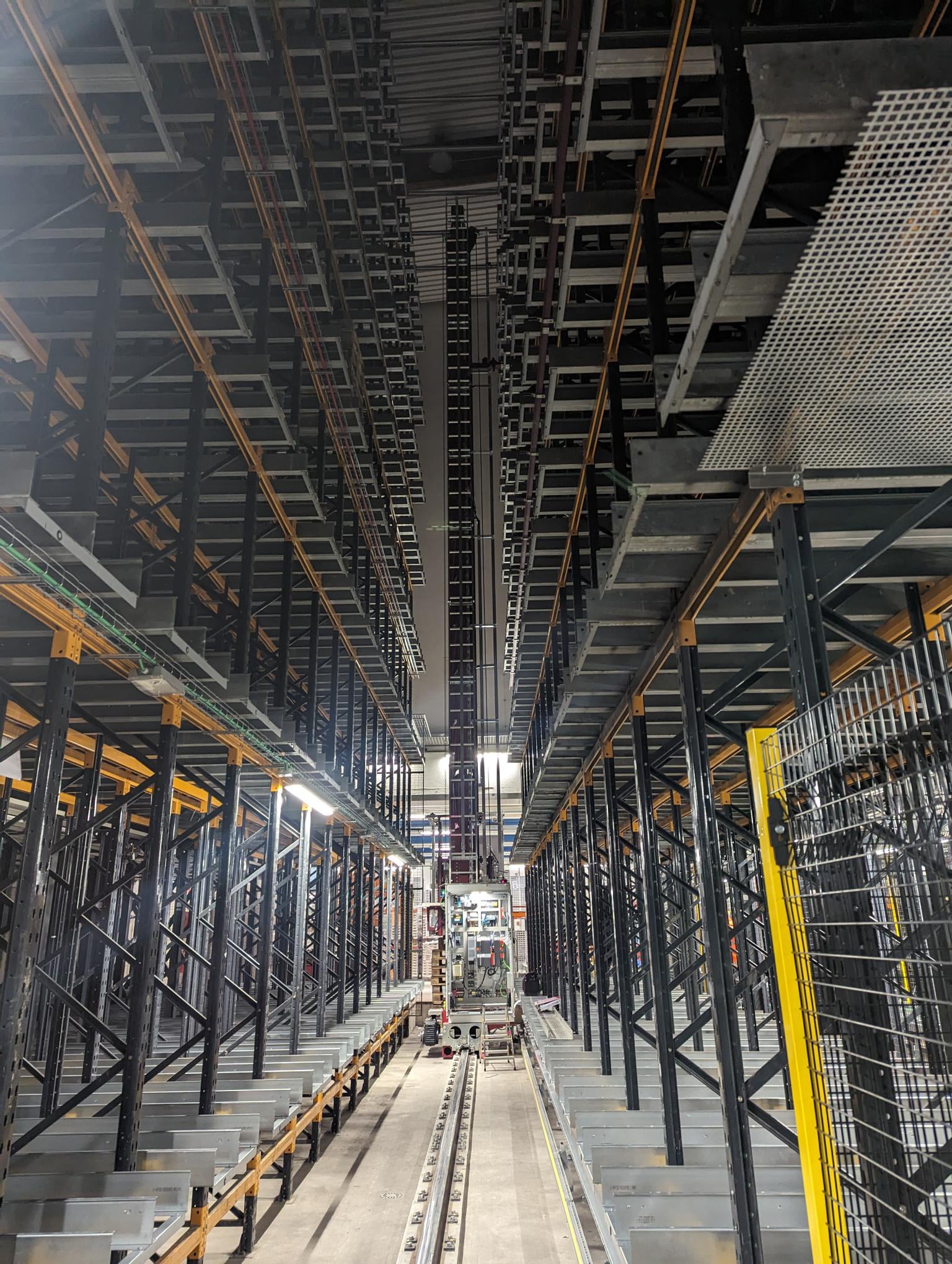 Eines der beiden neuen modernen, 16 Meter hohen Einmast-RBG in einer der beiden Lagergassen des Kühllagers.