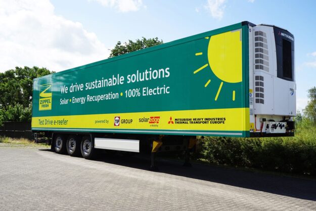 Mit Solar, E-Achse und Batterie versorgen gleich drei Energiequellen den Kühltrailer von Mitsubishi und Solaredge. In einem Pilot-Projekt bei TIP waren im Schnitt nur 20 Prozent des Energiebezuges aus Netzstrom…