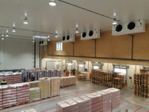 Die Kälteerzeugung in den neuen Lagerhallen wird durch zwei getrennte Anlagen dargestellt. Als Kältemittel setzt Hauser das zukunftssichere und klimaneutrale CO2 ein. Die optimale Kälteverteilung in den Kühl- und Tiefkühllagern bewerkstelligen mehrere Hochleistungs-Deckenluftkühler, die von einem begehbaren Steg gewartet werden können. Die Kühl- beziehungsweise Tiefkühlhallen in Pasching umfassen drei Temperaturzonen: Zwei Bereiche mit Normalkühlung mit je circa 15 000 Kubikmeter Volumen, die von +2 °C bis +16 °C umschaltbar sind. Dritter Bereich ist das Tiefkühllager in Silobauweise, das eine Temperatur von bis zu –28 °C bis +8 °C ermöglicht und ein Volumen von rund 23 000 Kubikmeter bietet. Hauser lieferte und montierte auch die Kühlraumtüren sowie die Isolierpaneele. »Ein großer Vorteil ist, dass wir mit den frei einstellbaren Temperaturzonen auf die Anforderungen der Kunden im Food- und Non-Food-Bereich flexibel reagieren können«, meint Scherbaum.