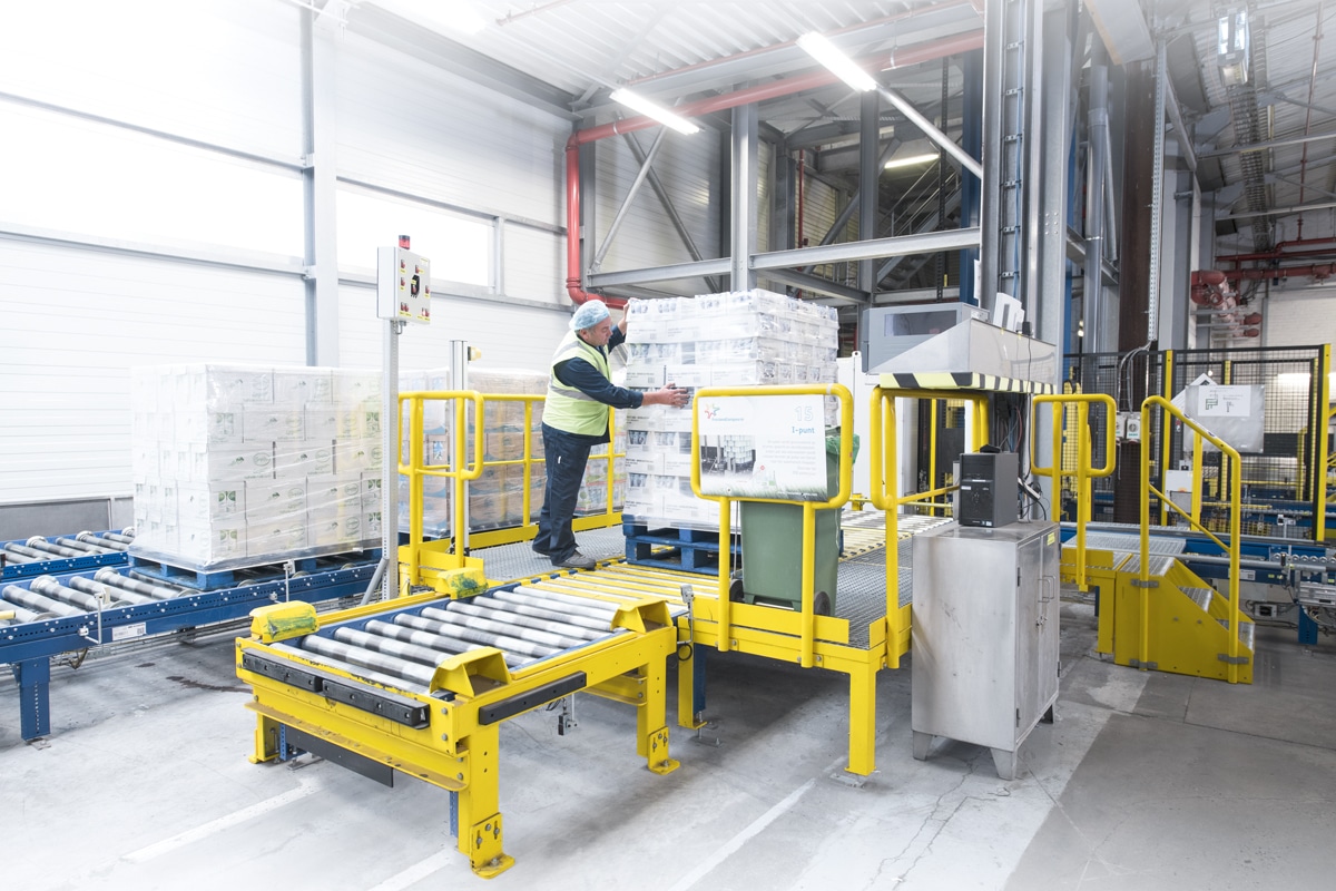 Nach der Produktion werden die automatisch palettierten Waren mit Stretchfolie gesichert und von der Fördertechnik in der Produktion auf die vollautomatische Förderanlage von SSI Schäfer übergeben. Die etikettierten Paletten werden zu einer Konturenprüfanlage transportiert, wo Gewicht und Abmessungen erfasst werden. Eine Datenplausibilität erfolgt durch den Abgleich der Soll- und Ist-Daten. Anschließend werden die Paletten an einen der drei Senkrechtförderer übergeben. Im Rahmen des Modernisierungsprojektes hat SSI Schäfer einen Förderer neu installiert, um das Materialflusskonzept dem gestiegenen Durchsatz anzugleichen.