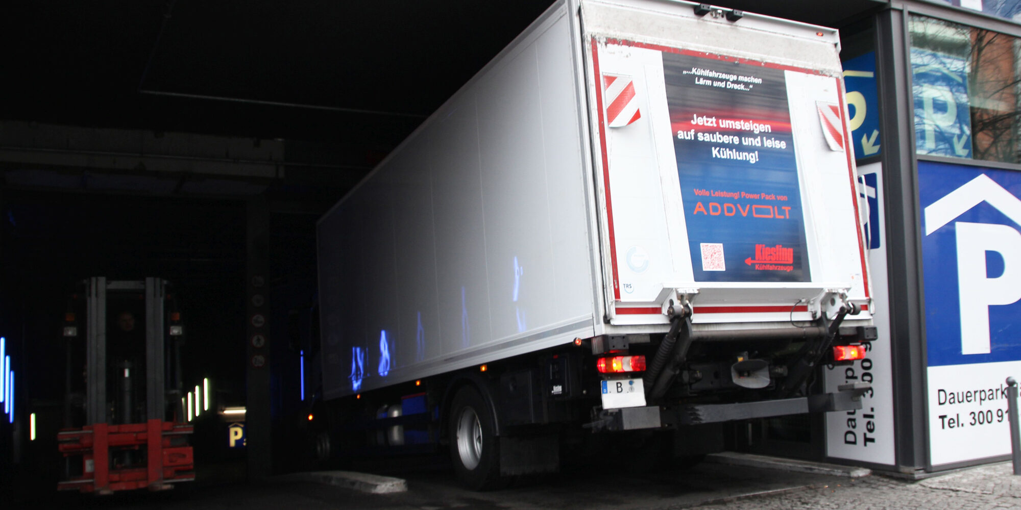 Mehrere Kunden des Unternehmens in der Innenstadt von Berlin verfügen über Tiefgaragen mit Ebenen für die Warenanlieferung. In diesen geschlossenen Räumen müssen ebenfalls alle Dieselmotoren abgeschaltet werden, da sich sonst gefährliche Abgase sammeln, die sich im Gebäude verteilen. Zusätzlich ist die Umgebungstemperatur in der Tiefgarage konstant bei 25 °C sehr warm, was zu einer schnellen Erwärmung des Laderaumes führt und die durchgehende Kühlung eigentlich absolut notwendig mache. »Für die beschriebenen Situationen waren wir auf der Suche nach einer Lösung, die eine konstante Transporttemperatur sicherstellt und gleichzeitig Lärm- und CO2-Emissionen vermeidet«, erklärt Berger. »Durch den elektrischen Betrieb während der Auslieferung können wir das lösen. Unsere bewährten Kühlaggregate werden mit dem Addvolt System ergänzt und mit Strom versorgt.«