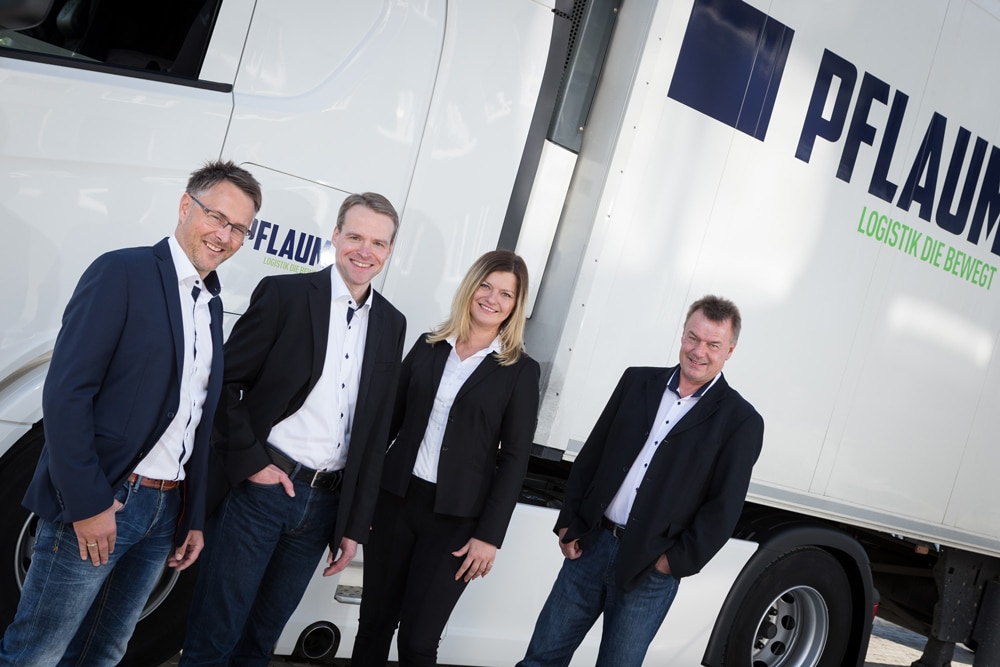 Entschieden sich in den drei Geschäftsfeldern Transport, Logistik und LKW-Service bereits früh für eine Digitalisierung aller Prozesse (von links): Pflaum Logistik Geschäftsführer Matthias Schellenberger, Teamleiter Telematik Frank Fischer, Prokuristin Ruth Pflaum und Geschäftsführer Norbert Fehn.