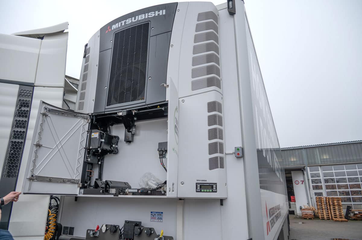 Das Sattelaufliegergerät TFV geht ebenfalls den elektrischen Weg, ein mit der vollelektrischen Variante TFV150-E ausgerüsteter Trailer stand bereits auf dem Hof des Betriebsgeländes. Bisher gibt es bei den Sattelauflieger-Maschinen lediglich ein Monotemp-Gerät, die Multitemp-Version werde voraussichtlich in einem bis eineinhalb Jahren kommen, erwartete Reckhorn, und zwar nur vollelektrisch. In Zukunft werde Mitsubishi für die vollelektrische Version der TFV150 verschiedene Größen der Batterien von 30 bis fast 100 kWh anbieten, und zwar von verschiedenen Herstellern. Die 100 kWh seien, schränkte Reckhorn ein, aber wohl sowohl vom Preis als auch vom Gewicht etwas überdimensioniert, die derzeit verfügbare 50 kWh-Batterie ermögliche »sehr gute« zehn Stunden Betrieb im Frischdienst. Prinzipiell sei auch der Anschluss an eine Generatorachse möglich, doch Mitsubishi setze derzeit auf den reinen Batterieweg. »Wir haben diverse Kunden, die sich gegen ein Generatorachs-System entscheiden«, berichtete Reckhorn, als Gründe würden der Verschleiß und der Mehrverbrauch beim LKW genannt, »aber das ist deren Meinung…«