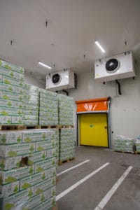 Für die CA-/ULO-Räume kommen dabei insgesamt 29 drückende Güntner Agri-Luftkühler mit drückenden Ventilatoren zum Einsatz. Für eine stufenlose Regelung der Sole-Vorlauftemperatur ist jeder Raum mit einer eigenen Ventilstation ausgerüstet. Die Luftkühler haben je nach Raumgröße eine Leistung zwischen 10 kW und 26 kW.