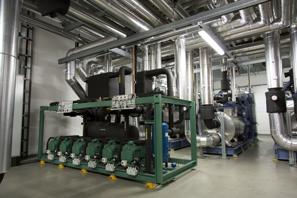 Insgesamt ist eine Verflüssiger-Leistung von 3100 kW installiert. Die Verflüssiger stehen in einem Verbund auf dem Dach neben der Photovoltaik-Anlage und sind für eine maximale Umgebungstemperatur von 36 °C ausgelegt.