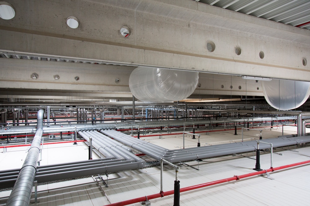 Die umfangreiche Verrohrung, die Luftsäcke der CA-/ULO- Druckausgleichsanlage sowie die Trockensprinkler-Anlage befinden sich oberhalb der Lagerräume.