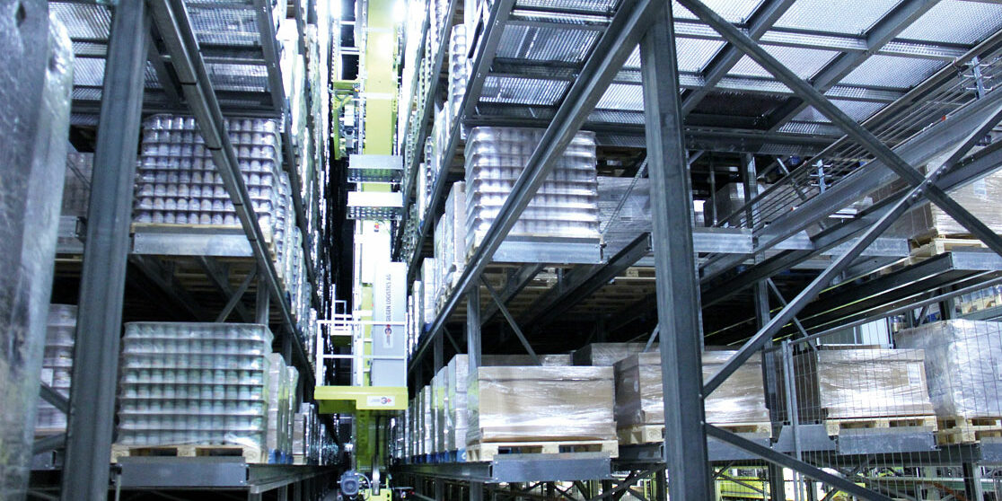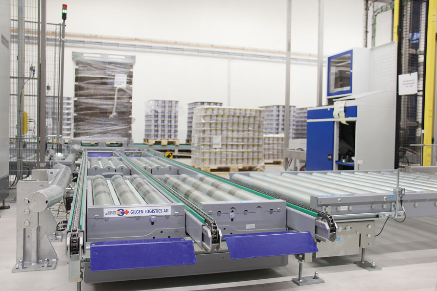 Die Anbindung der durch Hochdorf realisierten Dosenlinie 2 mit Anschluss an einen automatischen Lagenpalettierer wurde mit der Palettenfördertechnik erschlossen. Nach dem Stretchen, der Etikettierung und der Profilkontrolle der Paletten werden sie ins Hochregallager transportiert.