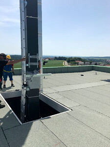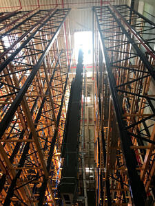 Die 17 Meter hohen Regalbediengeräte des Neubaus wurden über eine Dachöffnung in das Gebäude eingebracht.