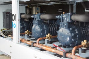 Die drei eingesetzten Dorin-Verdichter – der linke ist frequenzgeregelt. Im Hintergrund ist der Inverter zu sehen.