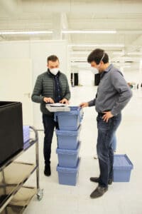 Christian Mohr (links), Produktmanager Business Unit Kunststoff bei Bito-Lagertechnik, und Benjamin Hilger, Leiter des Landesimpfzentrums Bad Sobernheim, im Impfzentrum mit den dort eingesetzten Mehrwegbehältern.