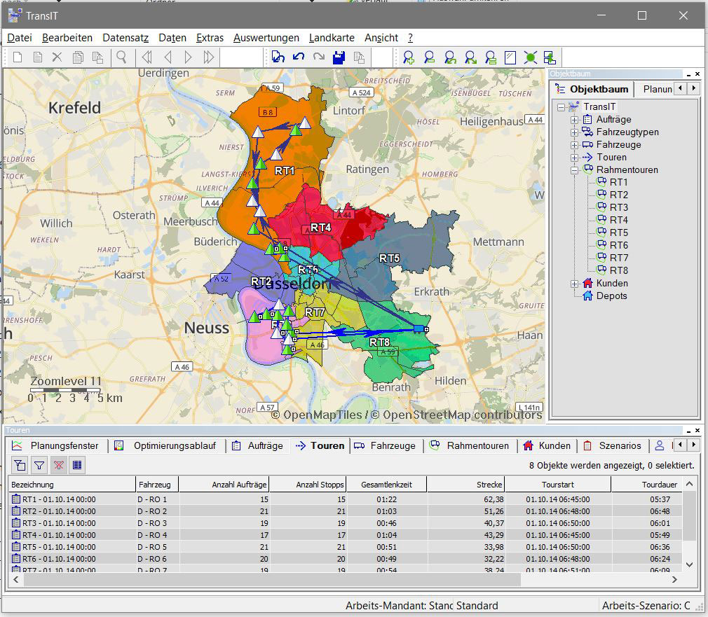 Grundsätzlich gilt: Je besser die Tourenplanung ist, desto niedriger sind die Transportkosten und desto weniger manuelle Korrekturen der Touren sind im operativen Tagesgeschäft erforderlich. Professionelle Tourenplanungssysteme unterstützen dies auf zwei Arten. An erster Stelle steht die Qualität der Rahmentourenplanung, welche die Grundlage für die operative Tourenplanung darstellt: Die Software plant hier auf Basis historischer Auftragsdaten. Ein Qualitätsmerkmal der Planung ist dabei eine gleichmäßig hohe Aus-, aber nicht Überlastung. Zeitlich sollten alle Touren möglichst gleichmäßig ausgelastet sein, da dies weitere Vorteile im Tagesgeschäft mit sich bringt. Die optimale geografische Einteilung der Rahmentouren minimiert Fahrstrecken und Lenkzeiten, was zu weiteren Einsparungen führt.