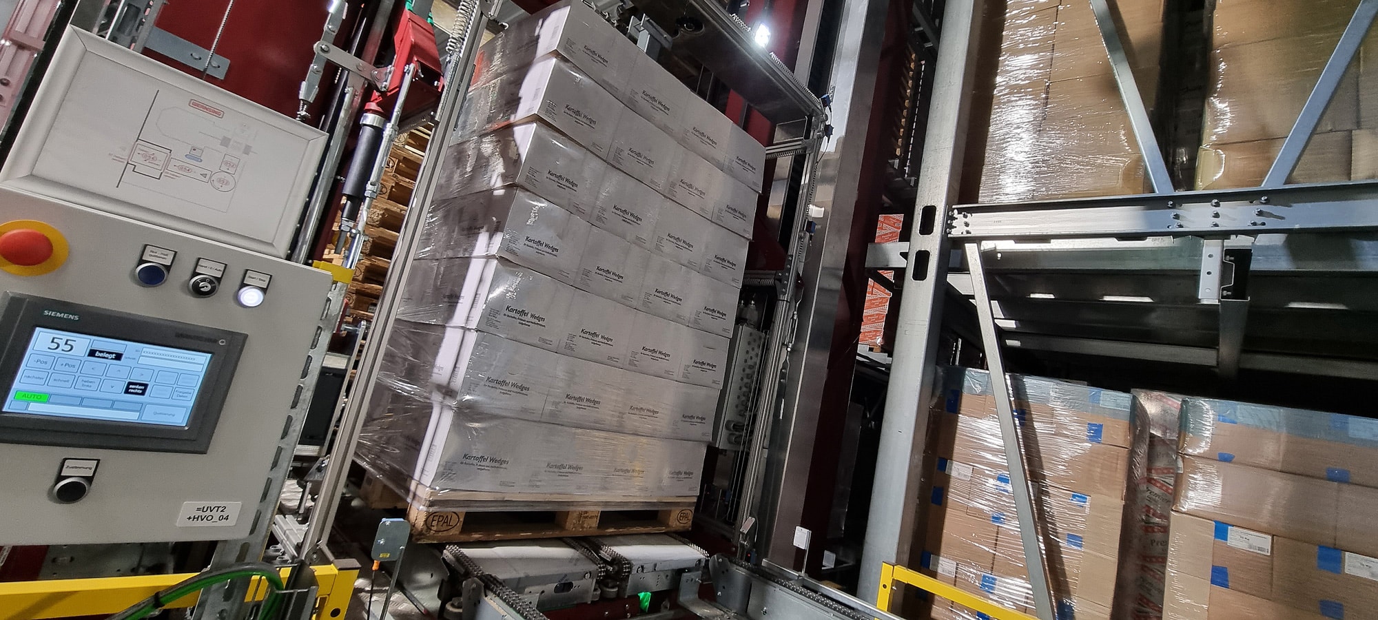 Gegenüber mehrfachtiefer Lagerkonzepte anderer Anbieter überzeugte Westfalia mit seiner Antwort auf die strapaziösen Bedingungen für Ladehilfsmittel. »Über lange Zeit hohe Gewichte – in diesem Fall rund eine Tonne schwere Einheiten mit Kartoffelprodukten – einzulagern, belastet Paletten enorm«, so Spitz. »Dadurch biegen sie sich in Lagern mit Zweifachunterstützung durch, es kann zu Störungen kommen. Mit der Kombination einer Dreifachauflage – einer zusätzlichen Mittelschiene in den Lagerkanälen – und dem Lastaufnahmemittel Ketten-Satellit ermöglichen wir lange Standzeiten bei hoher Verfügbarkeit der Anlage durch eine besonders stabile Lagerung und langlebige, zuverlässige Technik. Und unser Kunde kann problemlos auf Einwegpaletten ohne Unterpalette lagern, beispielsweise für den Export bestimmte Artikel.«