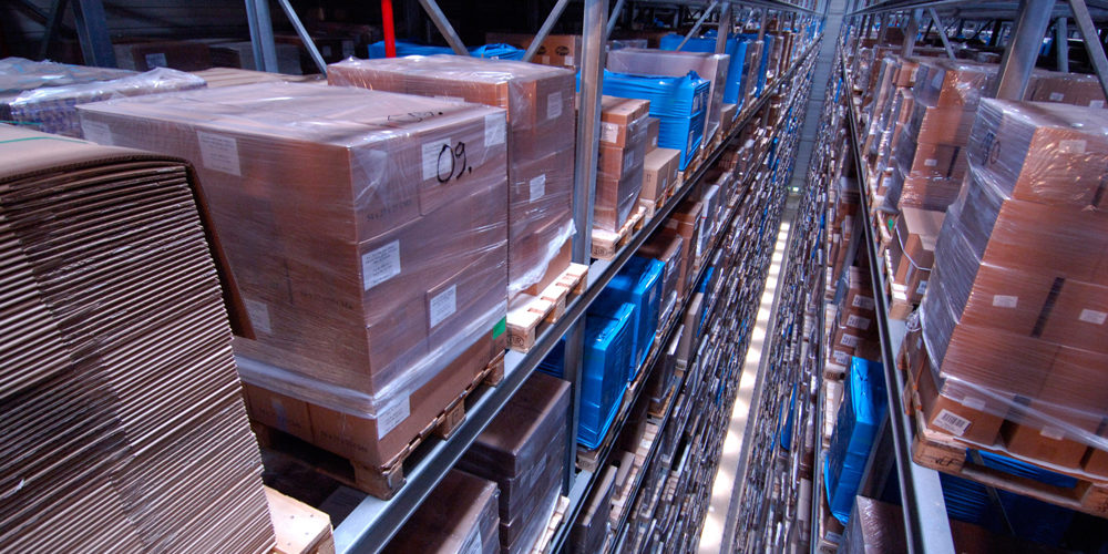 Im Hochregallager in Karlsruhe stapeln sich rund 20 Millionen Arzneimittelverpackungen auf etwa 15 000 Paletten.