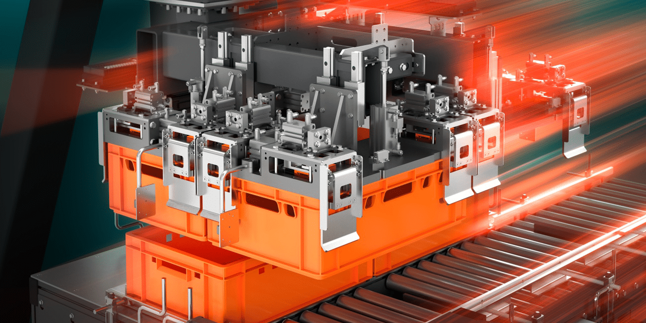 Um die KLT-Behälter optimal aufzunehmen und umzusetzen, nutzt Trapo ein Portal aus der HPS-Serie (High-Speed Portal System). Zur Stuttgarter Messe agiert es mit hocheffizienter Leistung auf begrenzter Fläche. Bestückt ist das Portal mit einem wartungsfreundlichen Produktlagengreifer. Die Aufgabe: je vier KLT-Boxen aufzunehmen und auf Fördertechnik umzusetzen – zwei direkt auf die Rollenbahn, zwei werden parallel gepuffert und nachfolgend abgeschoben. So entsteht eine kontinuierliche Abfolge zum Endstapeln und Palettieren. In der Praxis können mehrere Produktionsmaschinen angebunden werden. Der Portalpalettierer (de-)palettiert Boxen mit der beachtlichen Leistung von mehr als 1000 Boxen pro Stunde.
