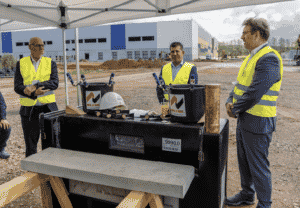 Bei der feierlichen Grundsteinlegung des Multicube Osthessen in Mecklar (von links): Matthias Fleischer, VP Supply Chain, Procurement und IS/IT der Nestlé Deutschland, Rana Matthias Nag, Geschäftsführer von Pfenning Logistics, und Björn Stammers, Leiter Logistik der Nestlé Deutschland.