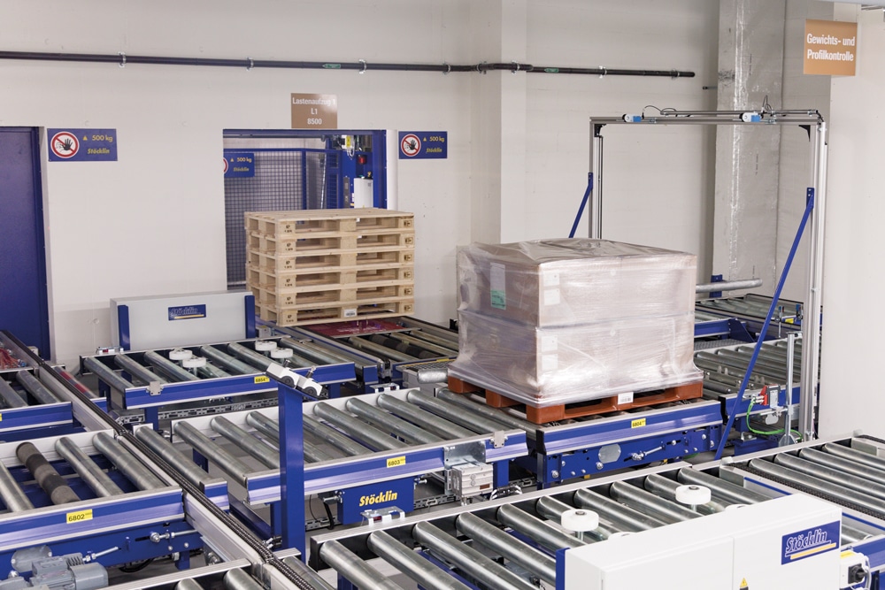 Im Erdgeschoss der neuen Gesamtanlage sind sowohl der Wareneingang als auch der Warenausgang angesiedelt. Zu vereinnahmende Ladeeinheiten werden manuell von Holz- auf Kunststoffträger umgesetzt, Ladungen geprüft, bei Bedarf über einen vollautomatischen Wickler mit Folie gesichert und mit Hand-Gabelhubwagen bodeneben auf die Fördertechnik aufgegeben. Via Paletten-Aufzug erfolgt die Weiterförderung in das siebte Obergeschoss, sprich ins Hochregallager. Die Zuladung ist auf maximal 500 Kilogramm pro Palette begrenzt.