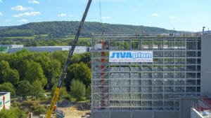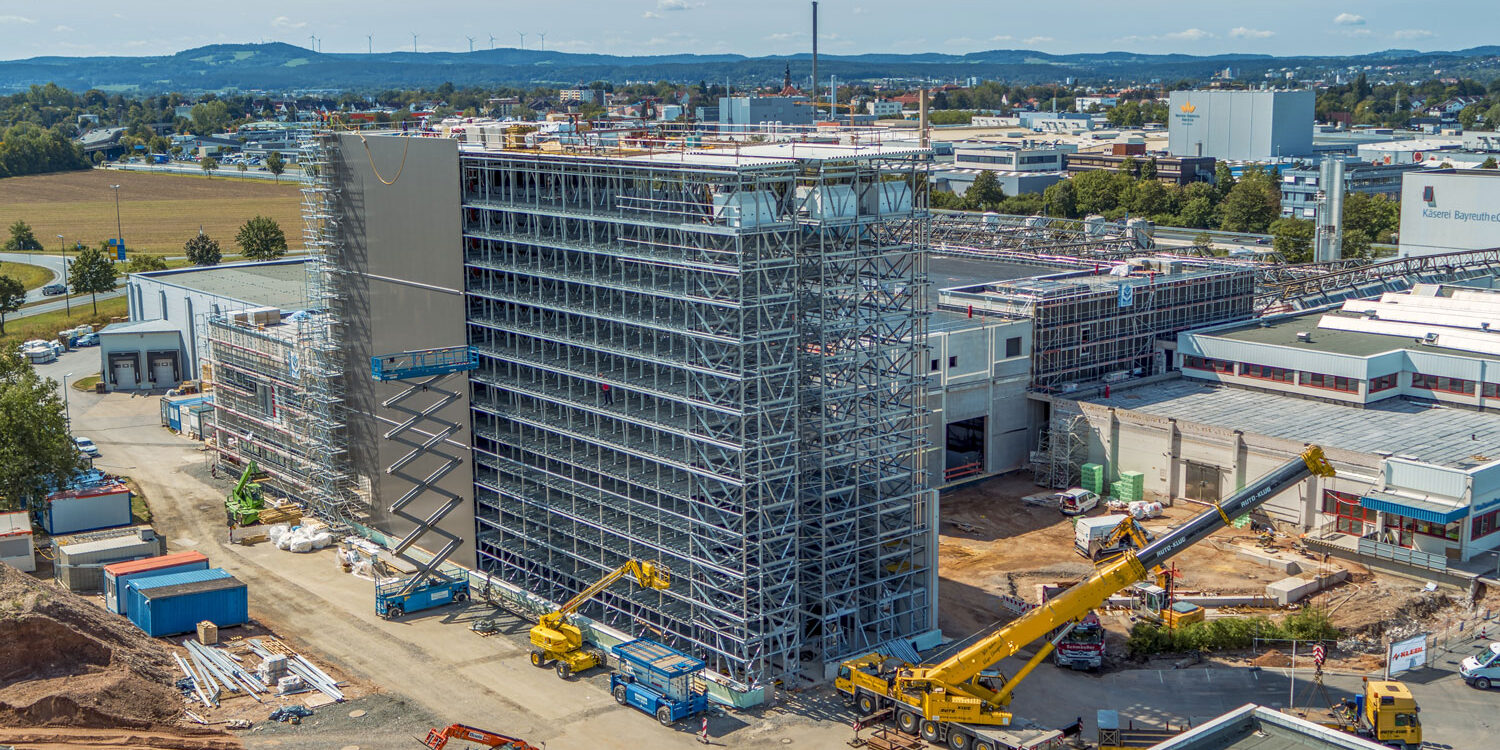 Am Standort in Bayreuth baut Sivaplan aktuell ein Kühllager für die Käseerzeugnisse der Firma Bayernland eG. Als Generalunternehmer liefert der Troisdorfer Lagertechnikhersteller hierbei von der Förder- und Lagertechnik über die Dach- und Wandverkleidung bis zur Lagerverwaltungssoftware alle Komponenten aus einer Hand. Das Kühllager wird in praktischer Silobauweise errichtet, bei der der Regalstahlbau als Träger für die Wandverkleidung dient.