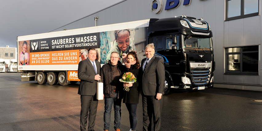 Die Meiberg Transporte GmbH in Soest schickt jetzt einen neuen Daf XF auf die Straße, der neben dem Lebensmitteltransport noch einen Zweitjob hat. Die hochwertig ausgestattete Sattelzugmaschine aus der limitierten Sonderedition zum 90sten Daf-Geburtstag wirbt mit einem auffällig beklebten Kühlauflieger für sauberes Wasser in ärmeren Regionen der Welt und ruft dafür zu Spenden an die Neven Subotic Stiftung auf. »Sauberes Wasser für Kinder überall auf der Welt ist nicht selbstverständlich. Dafür muss man viel tun – so wie die Stiftung des Fußballprofis Neven Subotic. Die baut mit Spendengeldern Brunnen und Sanitäranlagen in den ärmsten Gegenden der Erde. Das hat mir gefallen. Deshalb unterstütze ich die Organisation seit drei Jahren mit Geldspenden und den rollenden Werbeflächen«, erklärt Dirk Meiberg, Geschäftsführer des gleichnamigen Transportunternehmens mit Sitz in Soest. Insgesamt 15 seiner Fahrzeuge sind inzwischen mit großflächigen Spendenaufrufen unterwegs und haben neben viel Aufmerksamkeit auch schon messbare Spendenerfolge erzielt, wie Shari Malzahn vom Vorstand der Neven Subotic Stiftung während der Fahrzeugübergabe beim Daf-Partner BTS in Dortmund unterstrich.