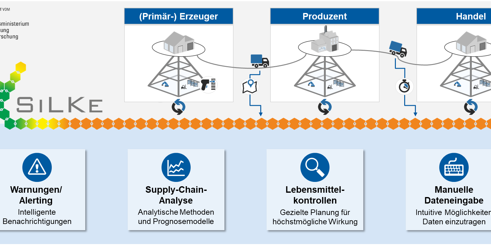 Das Forschungsprojekt »Silke – Sichere Lebensmittelkette durch die Anwendung der Blockchain-Technologie« stellt ein anbieterneutrales und bundesweites Projekt dar und wird vom Bundesministerium für Bildung und Forschung gefördert. Beteiligte Partner sind das FIR e. V. an der RWTH Aachen, das Fraunhofer-Institut für Angewandte Informationstechnik, die fTrace GmbH, das FZI Forschungszentrum Informatik, die Hochschule Niederrhein, die PSI Logistics GmbH, die Qinum GmbH sowie verschiedene assoziierte Partner aus der Praxis.