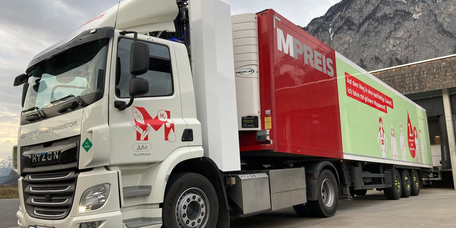 Der Wasserstoff-Kühlsattelzug fährt für die österreichische Supermarktkette MPreis.