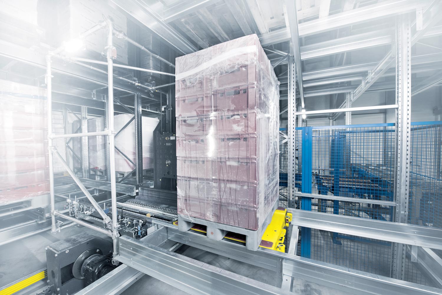Vor der Einlagerung durchläuft die Palette einen Konturencheck sowie eine Gewichtsprüfung und wird gemäß den Ergebnissen von der Software Wamas dem optimalen Lagerplatz zugewiesen.