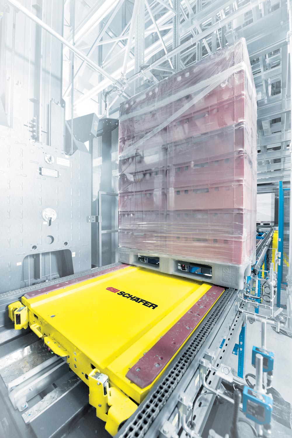 Zugeführte Paletten werden im Wareneingang in Wamas erfasst und durchlaufen vor Weiterführung einen Konturencheck inklusive Gewichtsprüfung. Auf Grundlage dieser Ergebnisse weist das Warehouse Control System (WCS) der Palette zeitgleich den optimalen Lagerplatz zu. Am Einlagerstich übernimmt der SSI Orbiter LHD den Ladungsträger. Vom Regalbediengerät wird sie an den zugewiesenen Lagerkanal befördert. Anschließend fährt der Orbiter mit den bis zu 1200 kg schweren Paletten über Schienen zum Lagerplatz und setzt sie dort ab. Die Auslagerung erfolgt analog. Dabei werden die Paletten per Fördertechnik auf eine Pufferbahn übergeben und zur Abholung via Stapler bereitgestellt. Die mehrfachtiefe Lagerung durch das Orbiter-Kanalfahrzeug ermöglicht eine besonders hohe Lagerdichte. Das System ist kabellos ausgeführt, beansprucht äußerst wenig Energie und verfügt über umfangreiche integrierte Sicherheitsstandards. Ein weiterer Vorteil für die Tiefkühllogistik sind die Power Caps an der Docking-Station auf dem Regalbediengerät, denn sie sind in Sekundenschnelle neu aufgeladen.