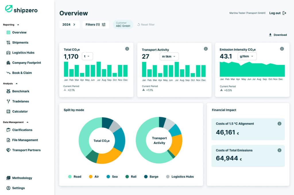 Das Dashboard der Shipzero Datenplattform gibt einen Überblick über die CO2-Emissionen eines Unternehmens.