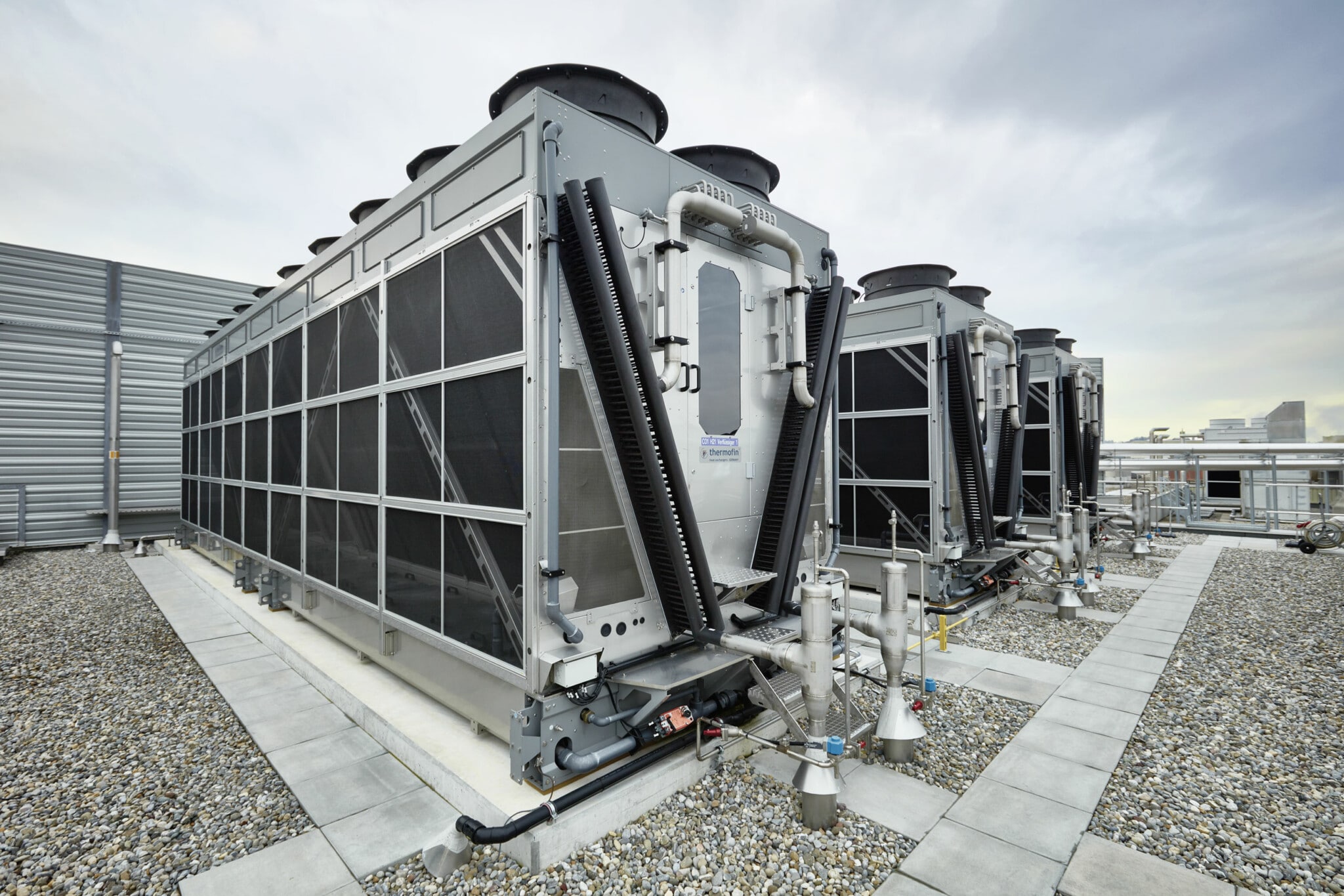 Die restliche Abwärme wird auf dem Dach mit drei hybriden Trockenkühlern an die Umwelt abgegeben. Diese Bauart zeichnet sich durch schwadenfreien Betrieb aus, unter 18 °C wird kein Wasser benötigt und die Geräte arbeiten ausschließlich mit Luft. Bei höheren Außentemperaturen werden die Lamellen mit Wasser benetzt und somit die Kühlleistung erhöht und der Verflüssigungsdruck abgesenkt. Die Geräte sind frei von Legionellen, die Bildung von Keimen wird durch UV Röhren, welche im Wasserbecken installiert sind, verhindert. Da bei dieser Lösung keine Biozide zum Einsatz kommen, ist auch diese Technologie nachhaltig und ökologisch.